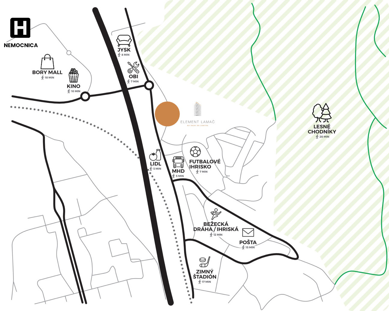 Nespornou výhodou je výborné napojenie na diaľnicu, ktoré zabezpečuje jednoduchú a rýchlu dostupnosť do ostatných častí mesta a pohodlné spojenie s Rakúskom, Českou republikou a Maďarskom. Obojsmerná zastávka MHD je od projektu Element peši vzdialená 5 minút, linka 37 z nej ide priamo do centra Bratislavy.